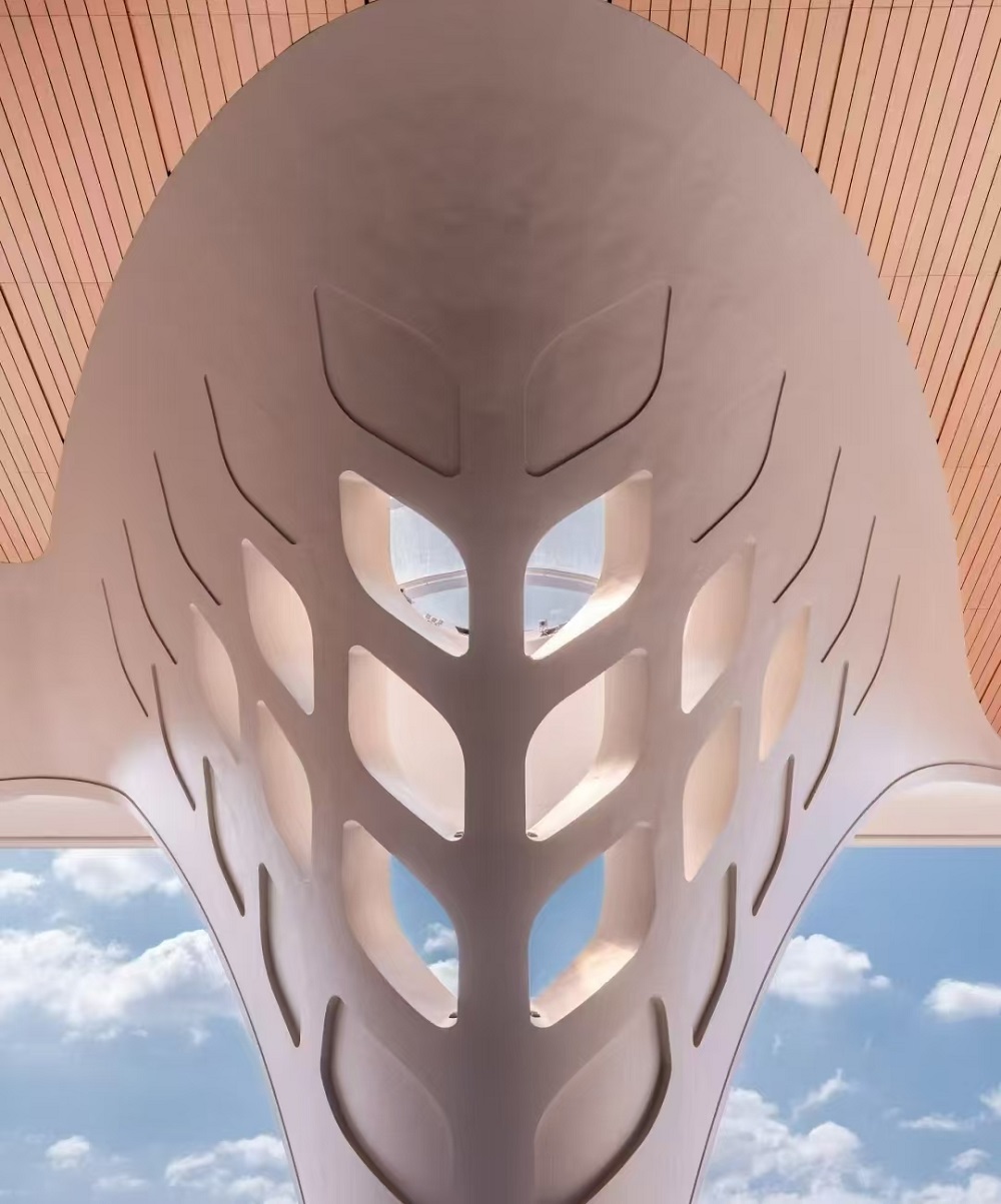重庆东站的外观设计独具匠心,汲取了重庆市的市树——黄桷树的灵感,以“山水千里、黄桷参天”为设计主旨。东西向的进站口六个巨大树形柱,宛如枝繁叶茂的“黄桷树”,其中41米高的双主柱采用喇叭形设计,29.6米的最大冠幅营造出强烈的视觉冲击力。该结构融合了60%双曲面、30%单曲面的不规则多曲面元素,形成了极为复杂的几何造型,从而成功打造出全球首例超高超大多曲面树型柱结构。树形柱的设计不仅艺术感十足,其枝干交错、曲线流畅的形态更是对材料加工技术提出了严峻挑战。