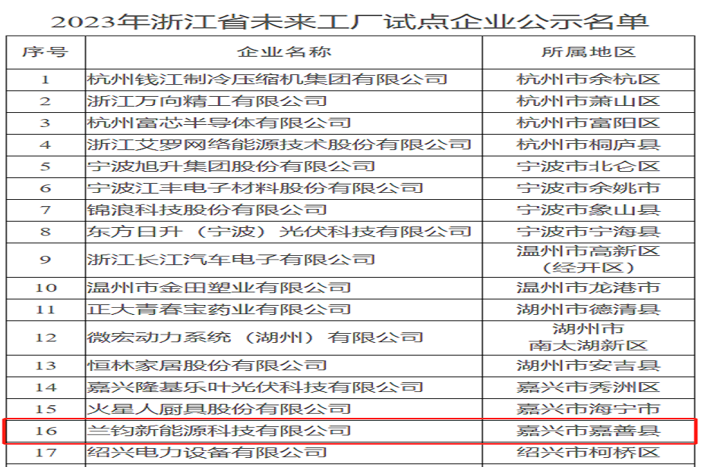 近日,浙江省经济和信息化厅根据《关于组织开展2023年浙江省未来工厂梯次培育项目征集和试点企业申报工作的通知》,经企业自愿申报、设区市审核推荐、省经信厅组织专家答辩遴选,公布了2023年浙江省“未来工厂”试点企业名单,兰钧新能源科技有限公司等30家企业成为“未来工厂”试点企业,并予以公示。